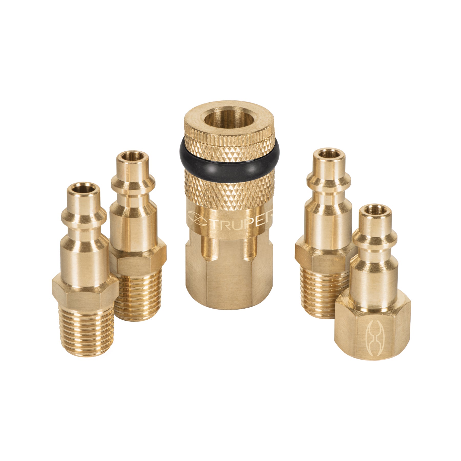 Set de 5 piezas de acoples y conectores rápidos fabricados en latón resistente, ideales para conexiones seguras y duraderas en sistemas de aire, agua o fluidos. Facilitan el montaje y desmontaje sin herramientas adicionales, ofreciendo eficiencia y confiabilidad en instalaciones.