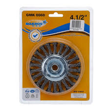 Cepillo circular de alambre de acero trenzado, con rosca interna y un diámetro de 4 1/2" x 3/8". Diseñada para trabajos de limpieza agresiva, remoción de óxido, pintura, escoria y corrosión en superficies metálicas. Compatible con esmeriladoras angulares. Ideal para uso industrial, metalmecánico y de mantenimiento pesado