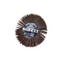 Accesorio abrasivo de 3 pulgadas de diámetro por 1/2 pulgada de ancho, con lija de grano N° 60, ideal para desbaste medio en metales, maderas y plásticos. Su diseño flexible tipo lengüeta permite acceder a superficies curvas o irregulares. Compatible con taladros y herramientas rotativas para trabajos de preparación y acabado.