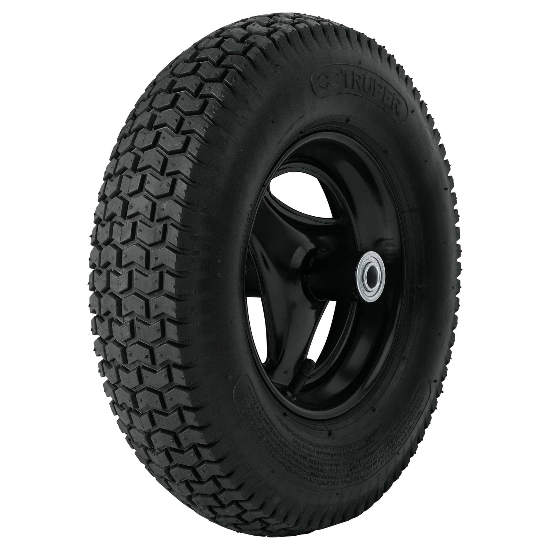 Rueda de 16 pulgadas con diseño reforzado y neumático inflable, ideal para carretillas que transportan cargas pesadas y requieren mayor resistencia y estabilidad.
